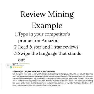 Amazon review mining is looking up products like yours (competitors) and pulling out interesting insights into your one reader’s objections, anxieties, and more. When searching Amazon look for: