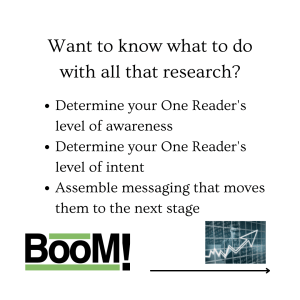 The converting messaging you are trying to write isn’t inside your head, it’s outside in the world. Do research to find what’ll motivate your one reader to buy. Get to know your one reader through research before you write anything. Find the best words from the people who are already customers or customers of your competitors.