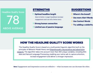It quickly provides you with the number of characters and the number of words. Then it gives you a headline quality score based on more than 300 unique variables. There is also an engagement score and an impression score.
