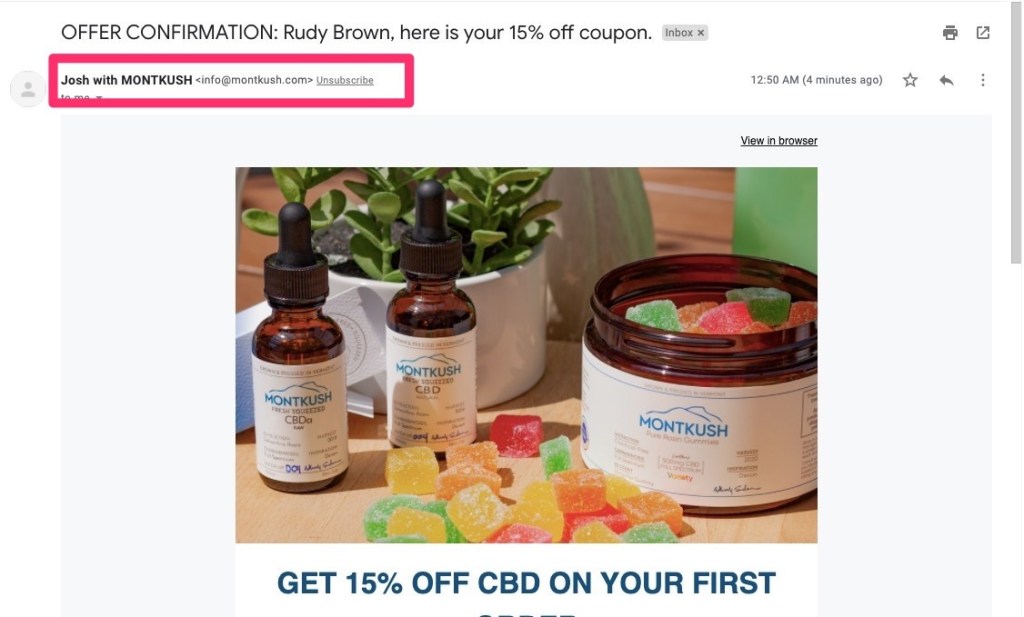 A detail you may overlook is who the email welcome flow is coming from. Some CBD brands prefer to use the first name to make it more personal.