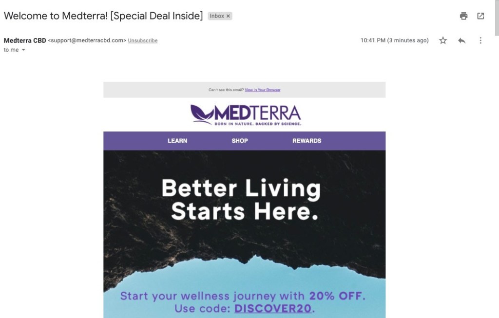 Timing is everything, there’s no exception with emails. Some CBD companies don’t even have a welcome flow, they send you a newsletter or send offers during the holidays. All should send it immediately but others send the first email a few hours or days after signing up.