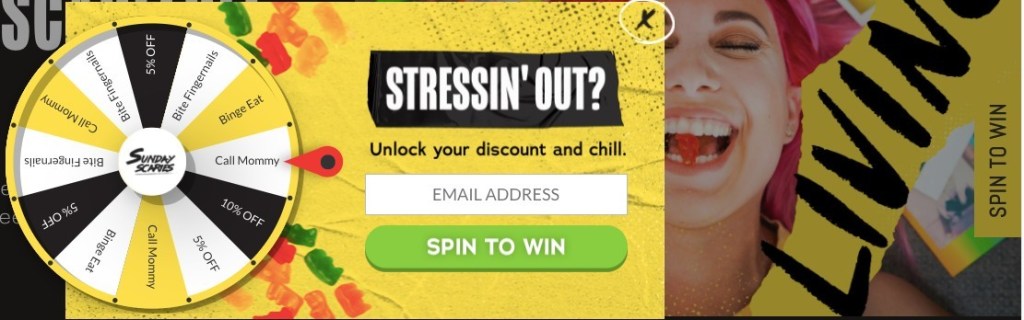 In the example below, this CBD company encourages its website visitors to “Spin to Win” with a pop-up.